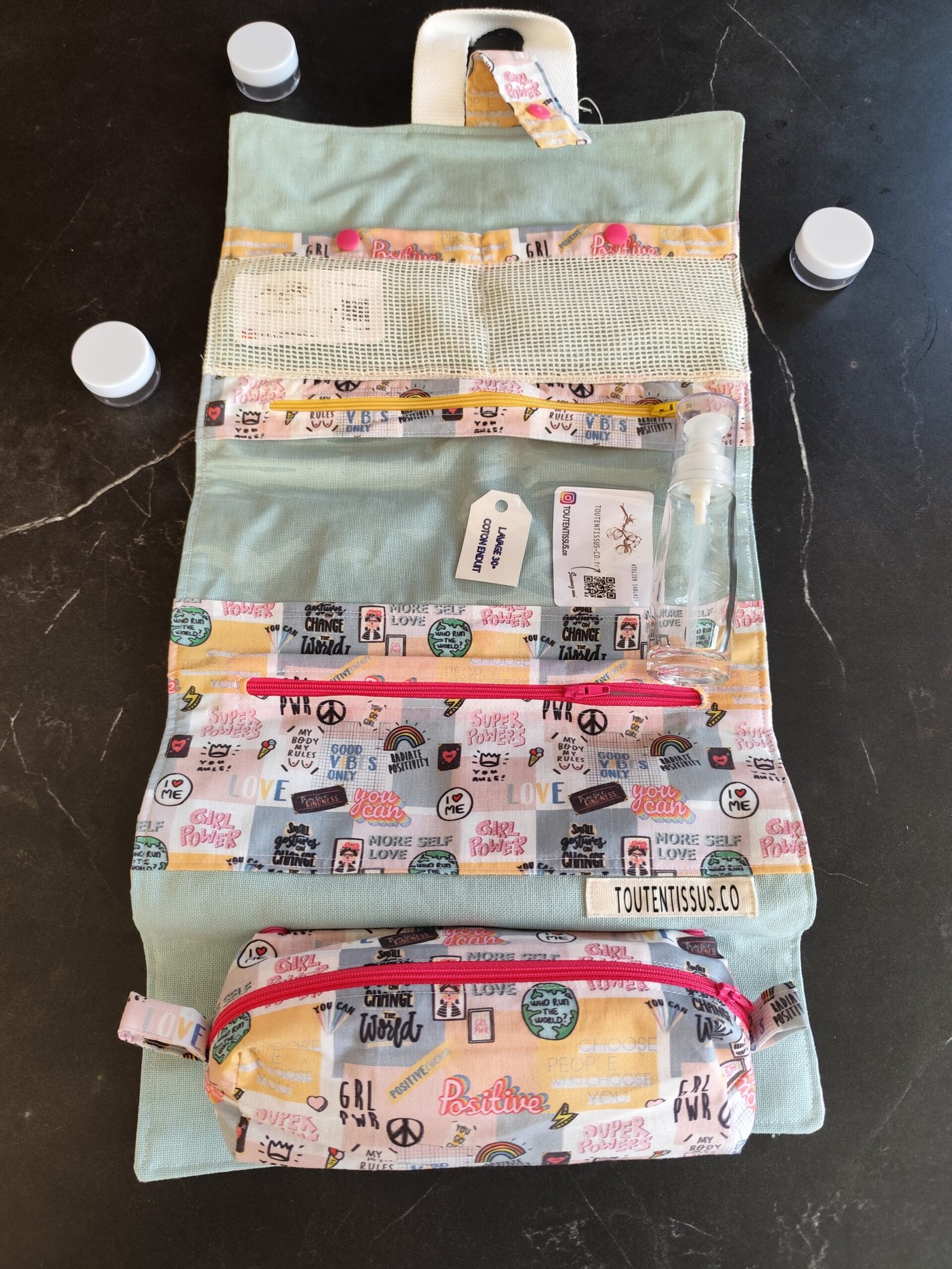 En coton avec 3 poches zip, dont une amovible! Tu pourras la suspendre partout !