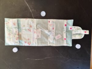 Tissus coton enduit vert eau à l’intérieur pour l’étanchéité des filets ( HAUTEUR : 10 cm) et y glisser vos savons durs.